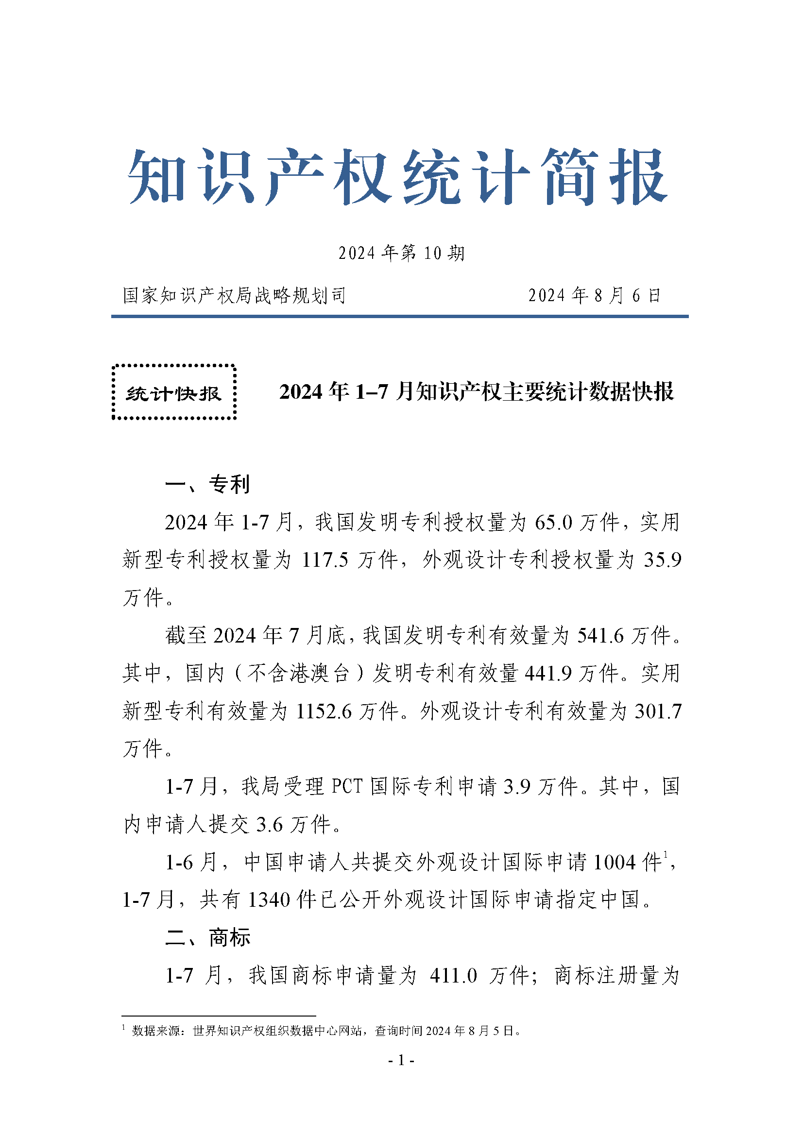 國(guó)知局關(guān)于2024 年 1-7 月知識(shí)產(chǎn)權(quán)主要統(tǒng)計(jì)數(shù)據(jù)快報(bào)