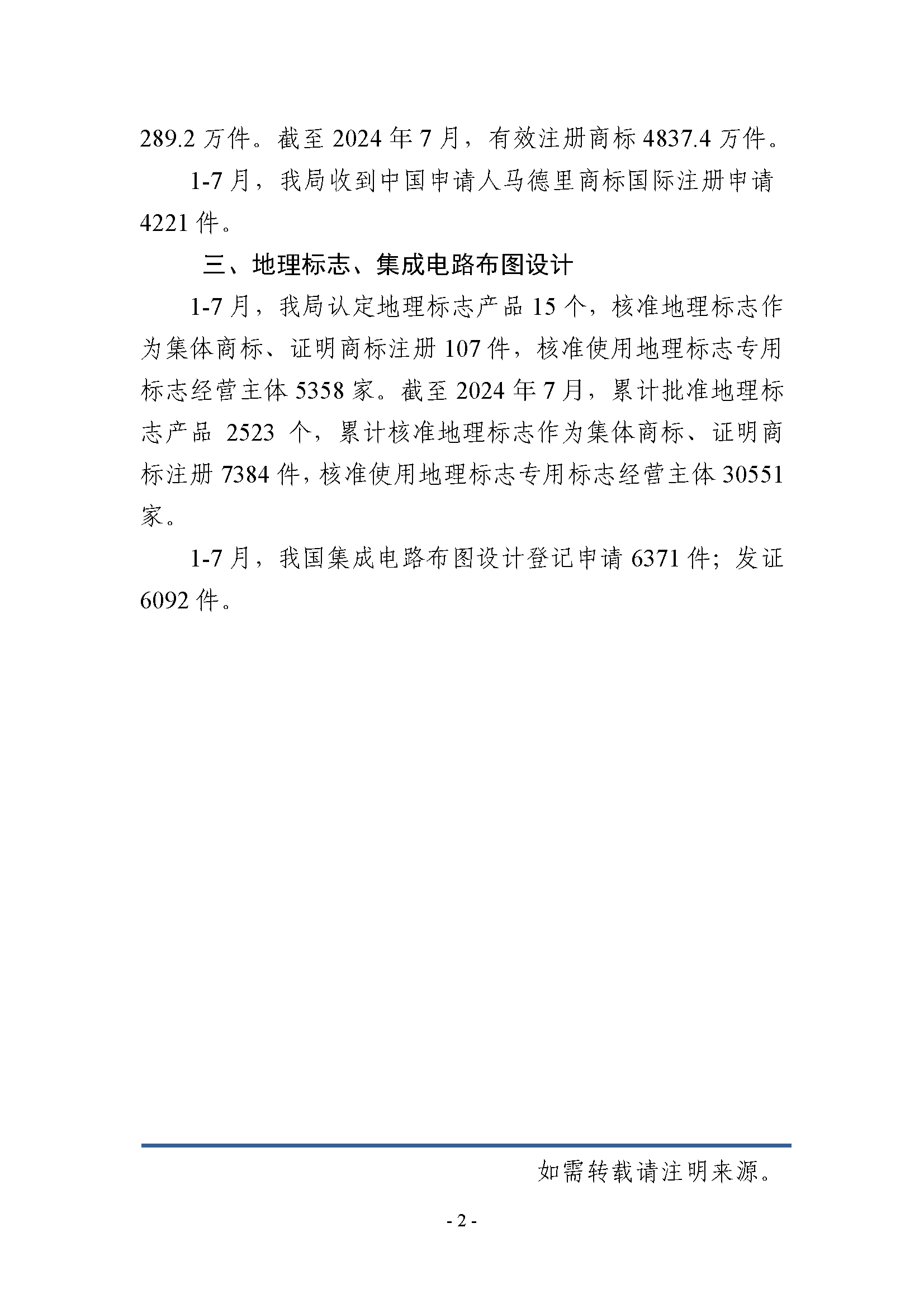 1-7月,我局認(rèn)定地理標(biāo)志產(chǎn)品15個(gè),核準(zhǔn)地理標(biāo)志作為集體商標(biāo)、證明商標(biāo)注冊(cè)107件,核準(zhǔn)使用地理標(biāo)志專用標(biāo)志經(jīng)營(yíng)主體5358家。截至2024年7月,累計(jì)批準(zhǔn)地理標(biāo)志產(chǎn)品2523個(gè),累計(jì)核準(zhǔn)地理標(biāo)志作為集體商標(biāo)、證明商標(biāo)注冊(cè)7384 件,核準(zhǔn)使用地理標(biāo)志專用標(biāo)志經(jīng)營(yíng)主體 30551家。1-7月,我國(guó)集成電路布圖設(shè)計(jì)登記申請(qǐng)6371件;發(fā)證6092件。