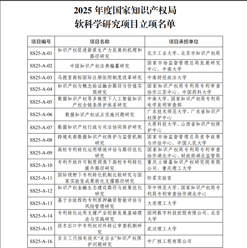 國家知識產(chǎn)權(quán)局辦公室關(guān)于印發(fā)2025年度軟科學(xué)研究項目立項名單的通知