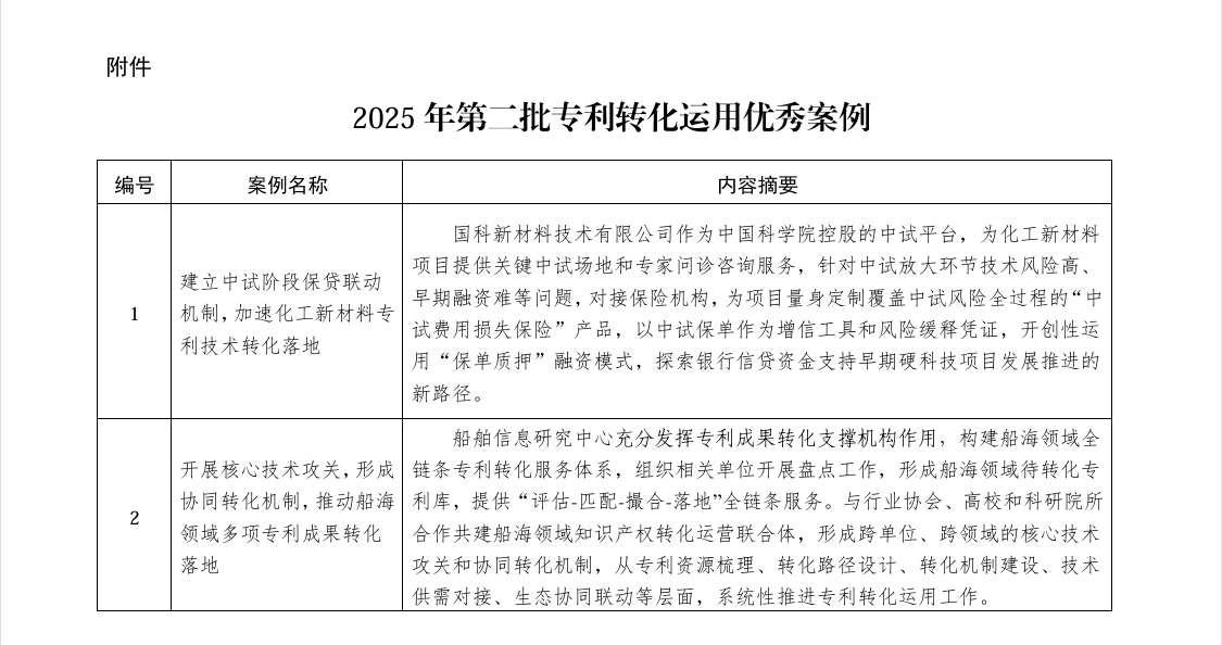 國家知識產(chǎn)權(quán)局辦公室關(guān)于公布2025年第二批專利轉(zhuǎn)化運(yùn)用優(yōu)秀案例的通知