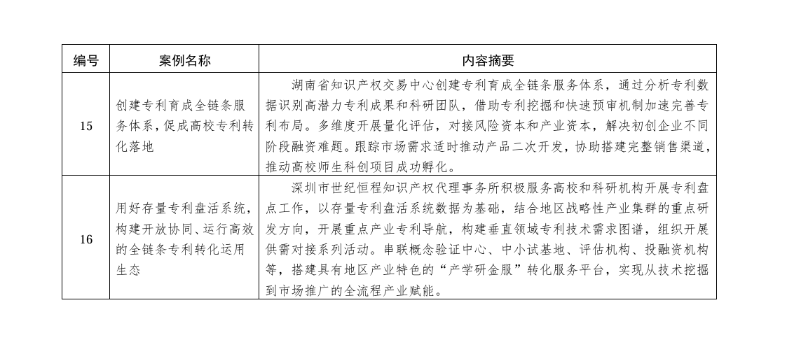 上述案例體現(xiàn)了各地區(qū)各部門指導(dǎo)服務(wù)機(jī)構(gòu)在推進(jìn)專利轉(zhuǎn)化運(yùn)用專項(xiàng)行動(dòng)重點(diǎn)任務(wù)落地過程中的有益實(shí)踐,創(chuàng)新性強(qiáng)、成效突出,具備復(fù)制推廣價(jià)值。請各省級知識產(chǎn)權(quán)局積極宣傳推廣案例,組織高校和科研機(jī)構(gòu)、企業(yè)、服務(wù)機(jī)構(gòu)等各類主體開展交流學(xué)習(xí),借鑒先進(jìn)經(jīng)驗(yàn),大力推動(dòng)專利產(chǎn)業(yè)化,加快創(chuàng)新成果轉(zhuǎn)化。