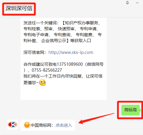 微信搜索關(guān)注【深圳深可信】公眾號,對話框發(fā)送關(guān)鍵詞【商標局】即可快速進入。